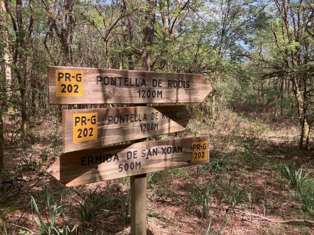 Durante el recorrido también se atraviesan zonas como la Pontella y el regato de Godis, pequeños cursos de agua y pasos tradicionales que aportan variedad al itinerario y permiten comprender mejor la relación histórica entre el territorio y el uso del agua. La ruta incluye además el paso por la capilla de San Xoán Bautista, un enclave aislado en medio del monte, cuya construcción data del siglo XVII y que forma parte del patrimonio cultural de la zona. En sus proximidades se encuentra la fuente de San Xoán o Augas Virxes, tradicionalmente asociada a propiedades populares y muy vinculada a la cultura local.